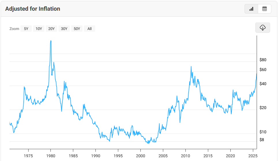 This chart shows that silver would have to reach almost $80 to match its inflation adjusted high of 2011.